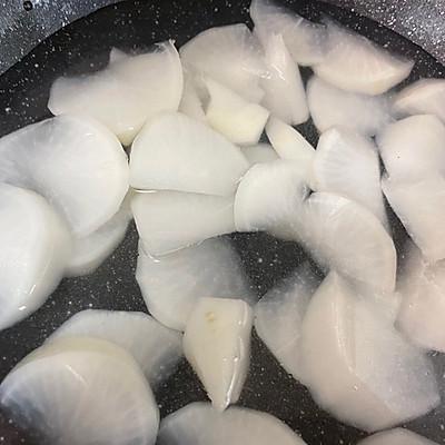 11、白萝卜去皮切块焯一分钟,捞凉水泡一泡。