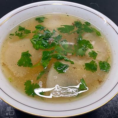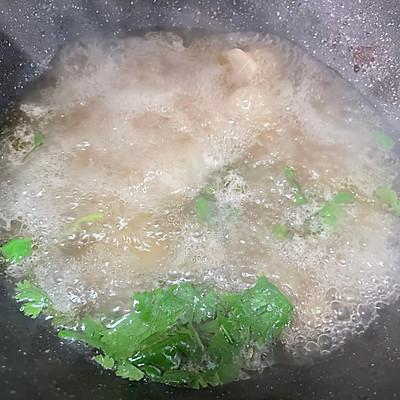 12、将白萝卜块捞出锅中,加入煮有骨头牛排的汤炖。 2 加入香菜几分钟。