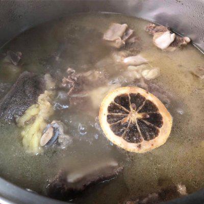 9、用水淹没带骨牛排,然后加入调料盒和柠檬片。