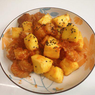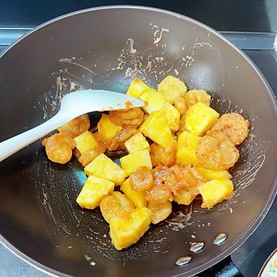 6、锅内不放油,先倒入汁液,搅拌至粘稠,倒入虾仁和菠萝块,快速翻炒。