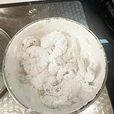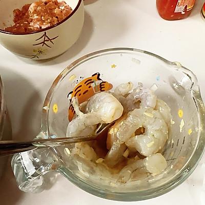 1、虾洗净,用葱蒜 盐 胡椒粉 油抓匀腌 10 分钟