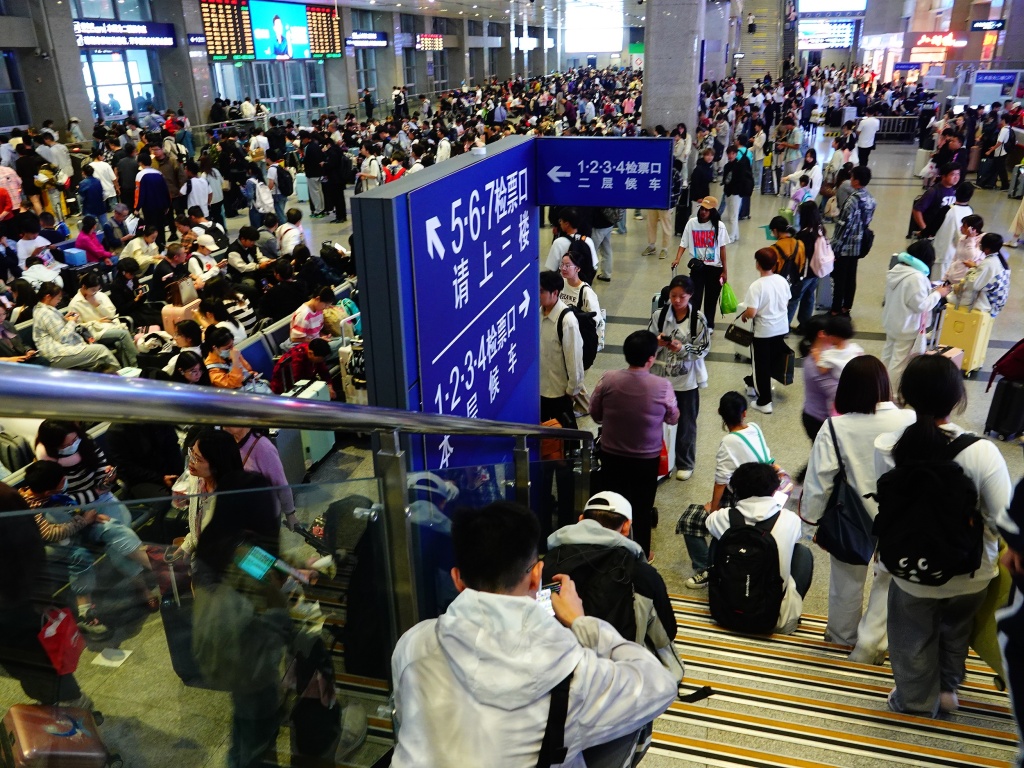 湖北宜昌,2024年10月1日,国庆假期第一天,宜昌东站铁路旅客摩肩而过。 视觉中国 图