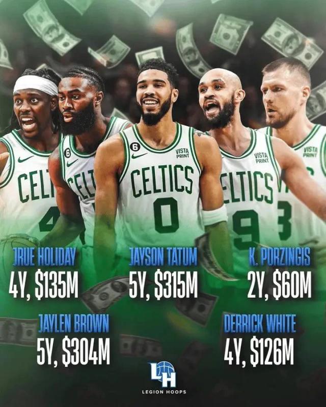 今年的休赛期,凯尔特人 5 年 3.15 塔图姆续签了1亿美元。超越杰伦 - 布朗的 5 年 3.04 亿美元,变成 NBA 最大的历史合同。在接下来的四五年里,双探花很有可能继续同队。另外,凯尔特人 4 年 1.259 德里克续签了1亿美元 - 怀特,保留了夺冠的核心阵容!