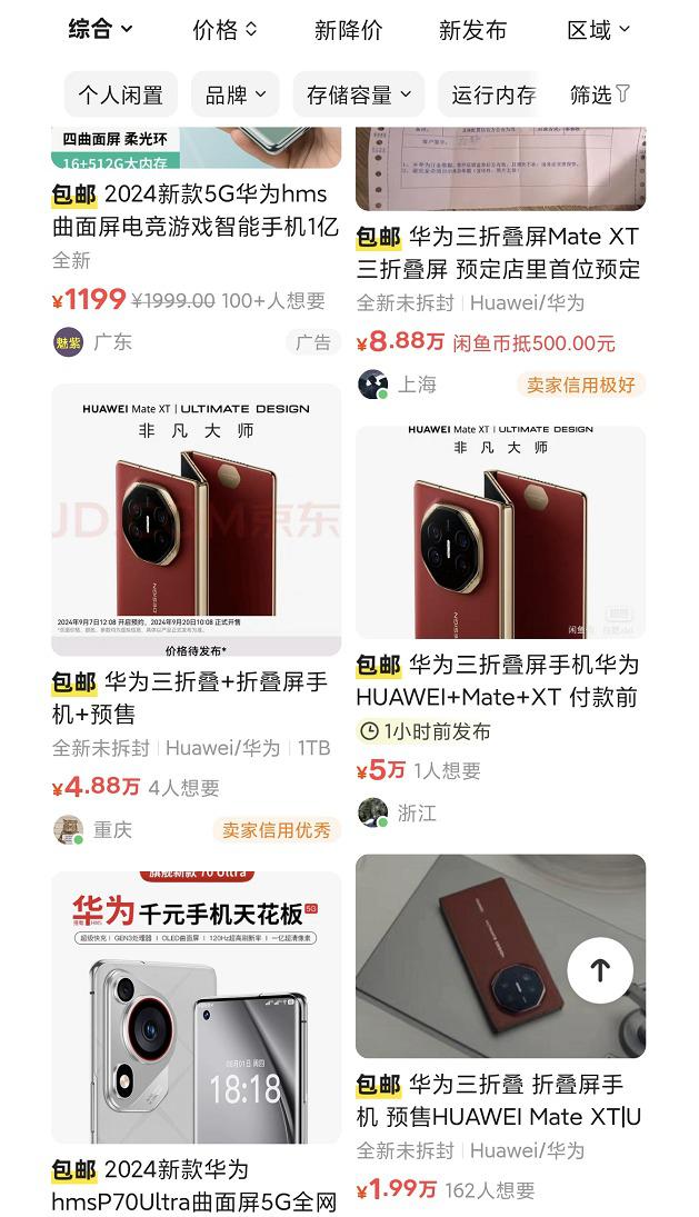 总而言之,在技术和产能的“不可抗力”下, Mate XT 供不应求,很难找到机器。预约购买门店和各大网络平台的人数已经超过100万。其他非官方渠道的现货溢价严重且合适。「理财产品」。