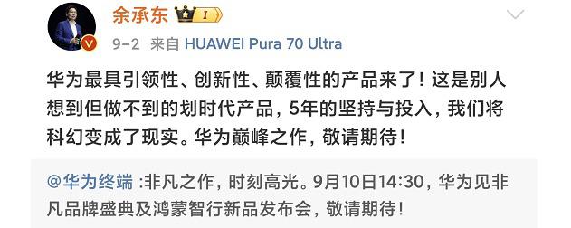 事实上,余承东此前在微博上表示,“华为这次带来的三折叠手机最具领先性、创新性和颠覆性的产品来了!这是别人想到但做不到的划时代商品,5 一年的坚持和投入,我们把科幻变成了现实。请关注华为的巅峰作品!”