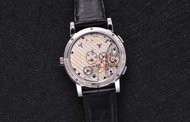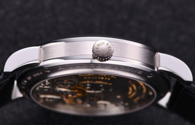 透背设计采用蓝宝石镜面玻璃后盖,透过后盖可欣赏到极其严谨精致的玻璃后盖。 L141.1 手动上链机芯和朗格标志性上链机芯 3/4 夹板,金套,蓝钢螺丝,细致的鹅颈式微调装置。光是仔细看看这个机芯的打磨和装饰艺术,就能充分理解为什么朗格可以成为德国造表领域的巅峰,除了朗格之外,很难有第二个品牌,因为它可以将德国的严谨和美学呈现到极致。
