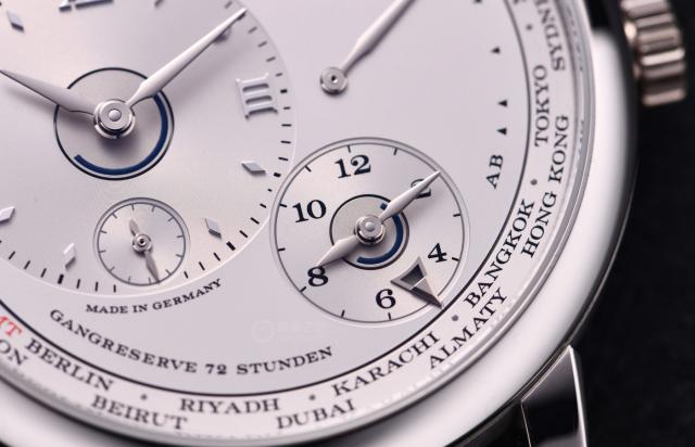 大的时候,分盘位于表盘左侧,显示原来的居住时间;小的时候,分盘位于表盘右侧 5 点位,显示第二时区时间;朗格专利大窗口设计用于日历显示,位于第二时区; 2 点位;动态储存显示位于 3 点位,通过弧形刻度盘直观地显示剩余的动力状态。在盘面外围设置 24 参考地点的城市圈让第二时区的时间一目了然,而夏令时的指示则通过一个巧妙的小窗口显示,相应的城市是否遵循夏令时用红色或白色指示。