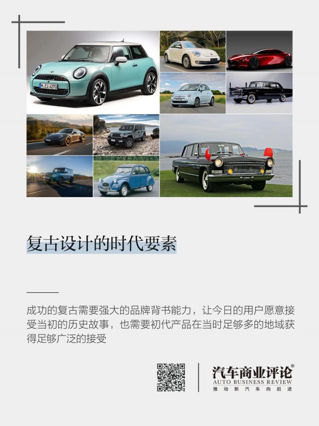 的确,如果车型在跨代演变过程中没有足够长的断代,那就算不上“复”这个动作了。今天大众提到复古最常想到的还是迷你。(MINI ) 、甲壳虫,菲亚特 500 这些经济型汽车之所以如此重要,是因为它们在第一代。 20 世纪 30-50 时代诞生后,取得了巨大的成功,获得了足够的公众知名度,但随后演变(虽然不情愿)被简单中断,新一代的设计直到千禧年前后才按照第一代经典造型重新进行。