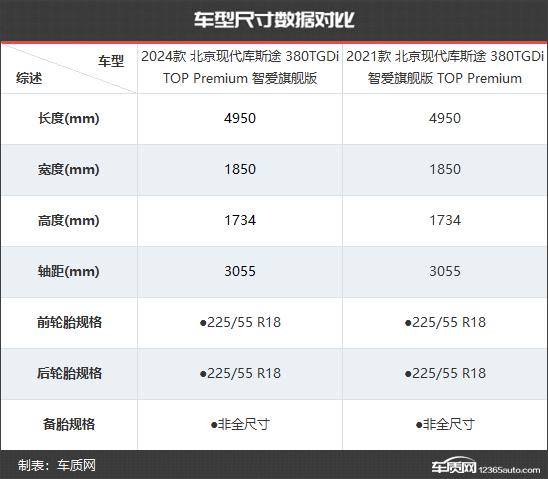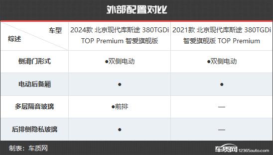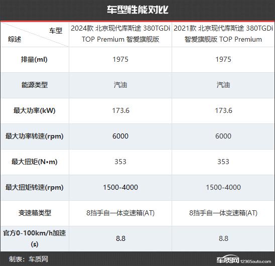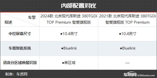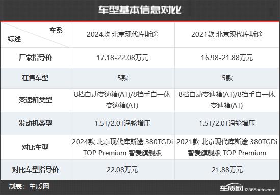 2024 北京现代库斯途推出了一款 5 款车,与 2021 汽车保持一致。在售价方面,新车型的起售价格和顶级配售价格略有上涨,售价区间为 17.18-22.08 一万元。为了更直观地看到新老车型在配置上的具体差异,我们选择了两款顶级车型进行对比。两者的区别只是 2000 元。