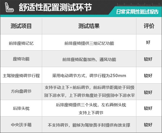 对主驾驶座进行检测时,对主驾驶座前端与末端之间的距离进行评估。 250mm,处于同级中游水平,基本能满足大多数驾驶员的需求。