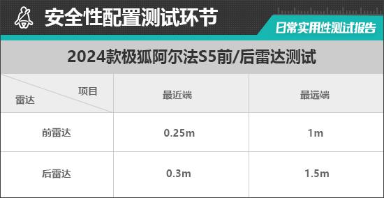 倒车雷达在测试过程中 1.5m 后面的物体可以感应到,雷达的功率表现相当出色。根据以往的检测经验,蜂鸣持续阶段越接近 0.25m 更接近日常使用习惯。根据实测数据,2024 极狐阿尔法 S5 倒车雷达持续蜂鸣提醒距离为 0.3m,和测试经验有一定的差距。