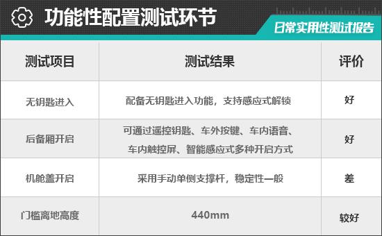 对评估汽车后备箱的基本值,我们也进行了实测,张口长度为 590mm;张口宽度为 1020mm;后备箱进入深度 1020mm;后备箱台与上面的垂直高度为 490mm。