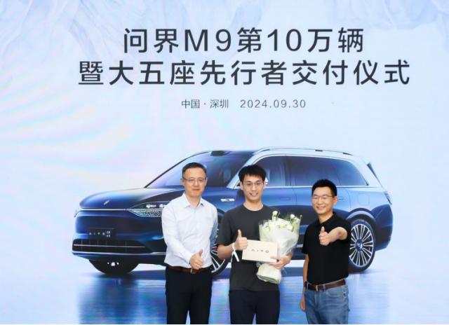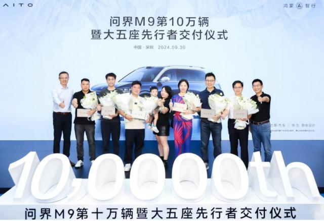 9 月 30 日,问界 M9 第 10 深圳举行了万台暨大五座先行者交付仪式,多名问界。 M9 邀请五位准车主参加。华为终端智能汽车选择业务部总裁汪严邈和赛力斯汽车总裁何利扬出席了新闻发布会,并为在场的车主交付了新车钥匙。