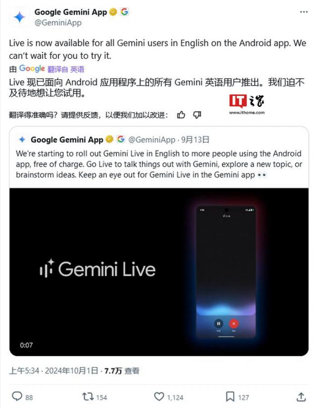 IT 世家 10 月 2 昨天谷歌公司(10日) 月 1 日)在 X 平台发表文章,宣布通过 Gemini 应用程序,现在面向所有安卓用户开放 Gemini Live 功能。