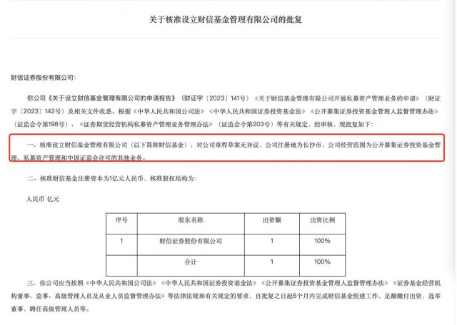 据报道,财信基金的注册资本是 1 股权结构为亿元,财信证券 100% 控制股票。控制和控制强调,根据有关规定的要求,自审批之日起 6 建立财信基金,全额缴纳出资,选举董事,聘用高级管理人员等。