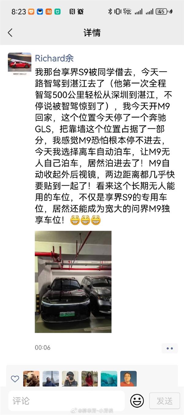 在朋友圈里,他分享了问界 M9 自动停车功能的精彩展示。原来这个停车位因为一侧靠近墙壁而闲置了很长时间,几乎成了余承东享界。 S9 专用停车位。