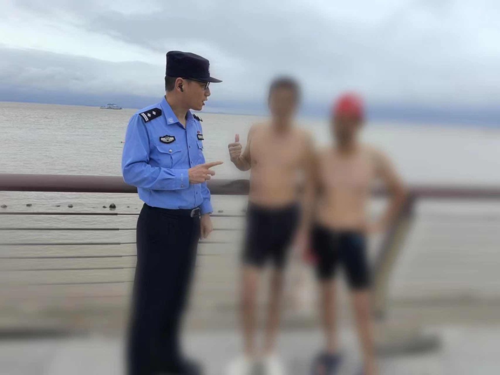 结合强风蓝色预警,警方耐心解释长江主流暗潮涌动和高风大浪带来的危险,并热情提醒,天气降温容易引起腿部抽筋,心血管不适容易危及生命。