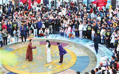 1 日本,曹禺名剧《日出》在和平路与滨江路交汇处的金街大铜钱广场上,吸引了游客停留。