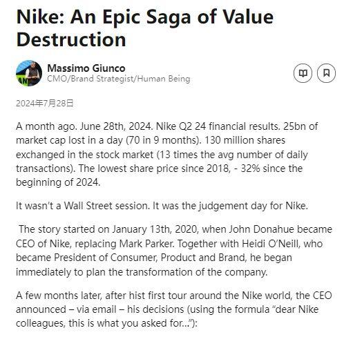 今年 7 月,对 Donahoe 批评声四起,Nike 前营销主管,在 Nike 有 21 年度工作经验 Massimo Giunco 直接从 LinkedIn 发表长文指责 Donahoe,称他是一位不听劝告的“数据驱动者”,光看标题就已经很震惊了…