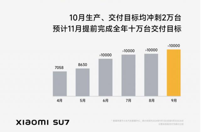 小米汽车估计 2024 年 11 月完成全年 10 万台的交付目标。9 月份,小米汽车的交付量超过 1 万台,已经连续 4 个月达成超 1 万台的交付目标, 10 月度开始持续提产,月度生产和交付目标将超过 2 万台。