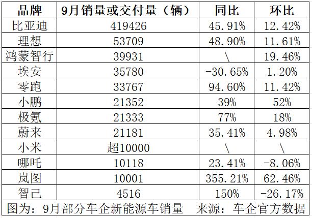 10 月 1 日本,比亚迪、理想、鸿蒙智行、蔚来、小鹏、零跑等车企发布。 9 月度“成绩单”。除销售(交付量)等数据外,多家车企还提到“创单月交付量历史新高”。