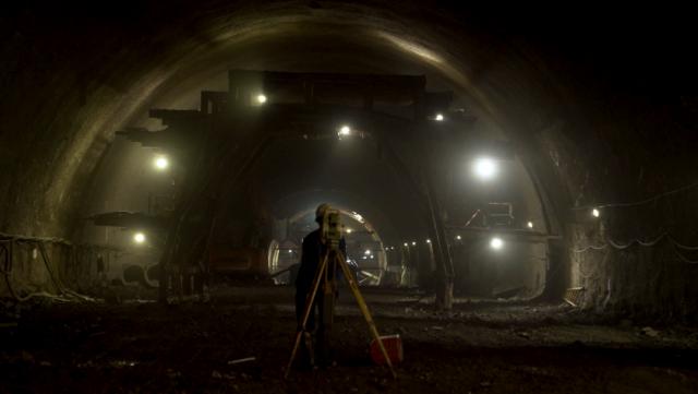 那天,全长约 4105 米盘州隧道也全线贯通。盘州隧道是盘兴铁路线上瓦斯最高的隧道。和妥乐隧道一样,也是一级高风险隧道。两条隧道穿越岩溶、煤层、瓦斯、小煤窑、可溶岩和非可溶岩接触带、膨胀岩(土壤)等各种不良地质条件,地质极其复杂。同时,隧道施工点位于山区,入口路面弯曲陡坡,大型机械和材料难以入口。先进工装设备的应用和施工进度面临挑战。