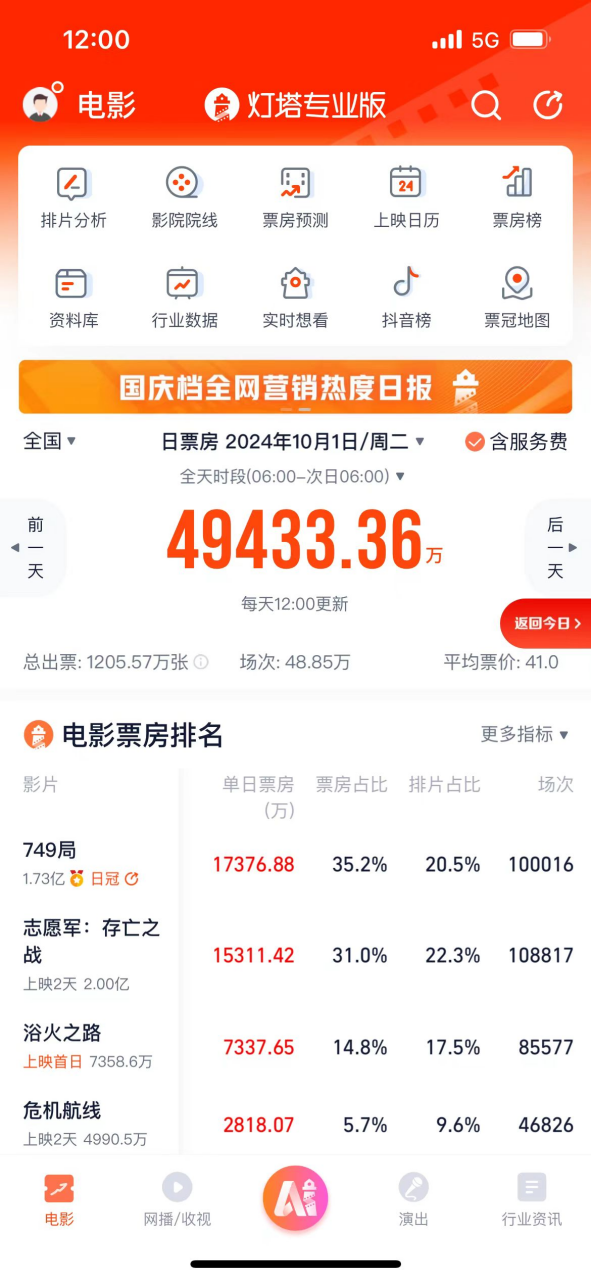 根据灯塔专业版的数据,截至10月2日11时,2024年国庆档第一天(10月1日国庆),市场票房超过4.94亿,票房前三名分别是《749局》1.7亿,《志愿军:生存与死亡对决》1.5亿,《浴火之路》7337万,其中前两部“大片”构成了票房第一梯队,总共贡献了市场近三分之二的票房。