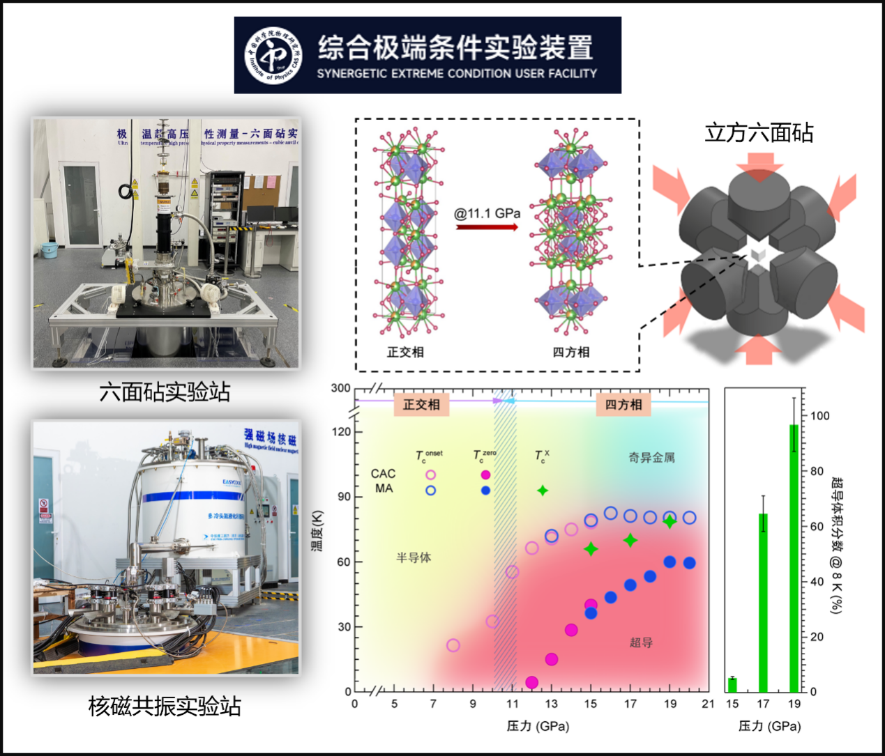 六面砧高压试验站和强磁场磁共振试验站的实物照片,以及La2PrNi2O7多晶样品的高压结构演变和超导图,都是综合极端条件试验装置。