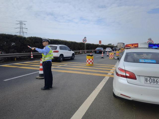▲湖北省公安厅高警总队民警在施工路段指挥车辆通行。