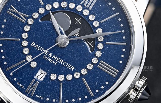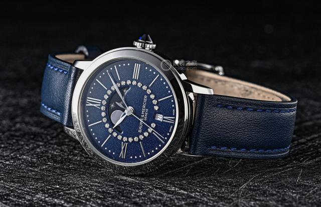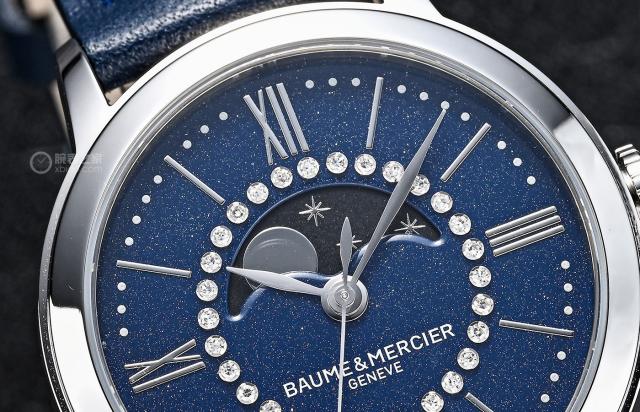 月相盘在 12 点,在黑色星空圆盘的背景下,飘着白色的雪花,一轮银月出现在佩戴者的视野中,与深蓝色的表盘相得益彰,更加浪漫。