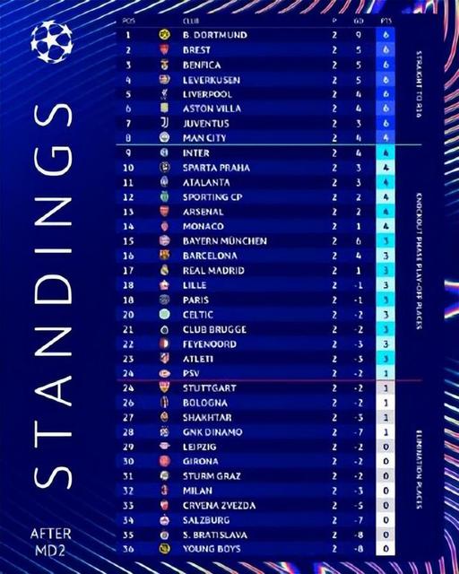 但在 2 除了维拉和利物浦,还有尤文、多特、勒沃库森、本菲卡和布雷斯特,这些都赢得了比赛。 5 支队;其中,多特蒙德位居榜首。大黄蜂本轮 7:1 狂扫凯尔特人,以净胜球排名第一;排名第二的布雷斯特也在法甲发挥出色。在第一次参加欧冠的前提下,他们各自发挥。 2:1 和 4:0 比分;是目前法甲唯一一支全胜的球队。