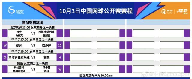 2024 年中网公布 10 月 3 日程表上,中网女单在下半区迎来了两场八强战争,中国 35 老将张帅对阵前世界第二,15 种子巴多萨,张帅第一 3 第二次晋升中网八强后,能否第一次晋升中网四强追平李娜和王蔷的纪录令人期待,四强追平李娜和王蔷 前美网冠军高芙将与黑马斯塔罗杜布采娃进行资格赛。另外,中国金花组合汤千慧 / 袁悦将出战,冲击女双四强名额。