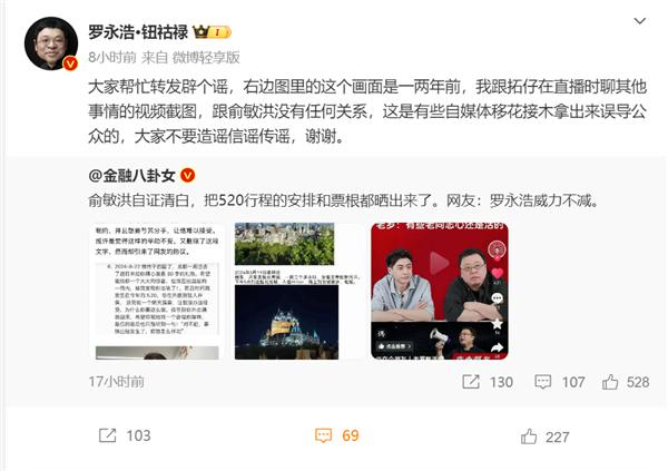 昨天晚上,罗永浩发布辟谣帖,称自己并未在直播中暗喻俞敏洪“有些老同志心还活着”。