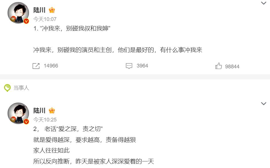 经过一天的差评洗礼,导演陆川今天上午连续发了三条微博回复,隔空喊道“有什么事要冲我来”,认为差评是“家人的爱”。