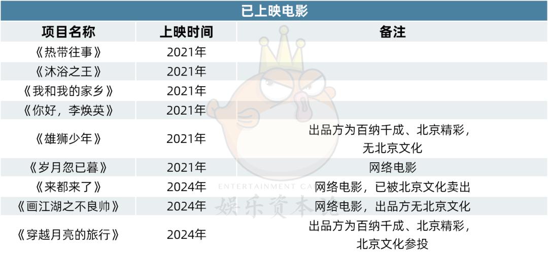 在2019年年报中,北京文化甚至参与了两部不良英俊IP的真人电影,但此后,这两个项目也在2021年后消失在年报中,其中《画江湖不良英俊》今年上映。