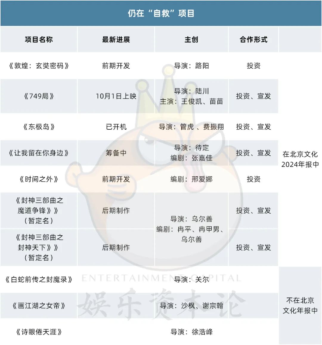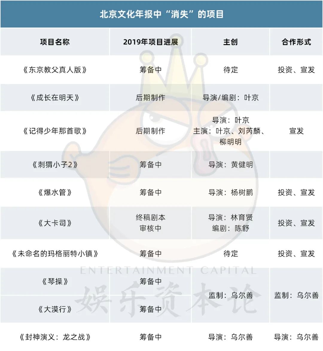 然而,直到上映,我们才知道,这部“只注重特效”的科幻大片,就像一块历史化石,反映了影视热钱时代的疯狂。:包括《749局》在内,北京文化曾经的“爆炸性制造机”爆炸影响了数十个项目。2019年北京文化年报中,共有28个电影项目。据娱乐资本理论统计,目前只有少数项目上线,如《沐浴之王》《封神第一部》《我的人民我的家乡》《你好,李焕英》,后期年报中“消失”的项目更多。在年报中继续留在头部项目也是常年处于“准备”或“前期开发”的状态。