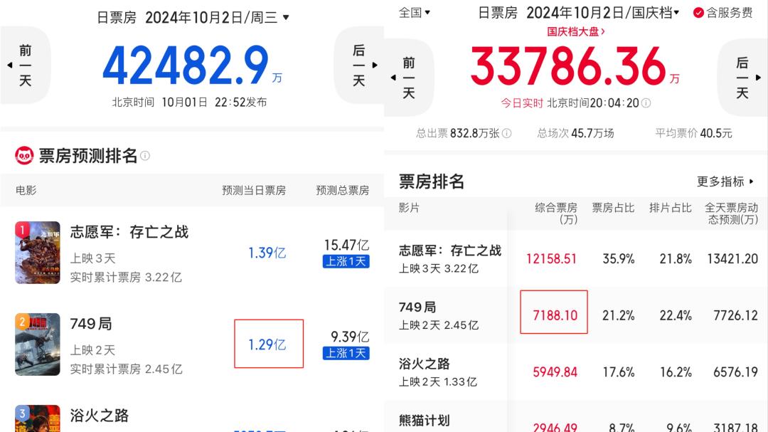 口碑撕裂造成的影响是直接的。。第二天,《749局》的票房从预期的1.2亿悬崖式下降到7000万。