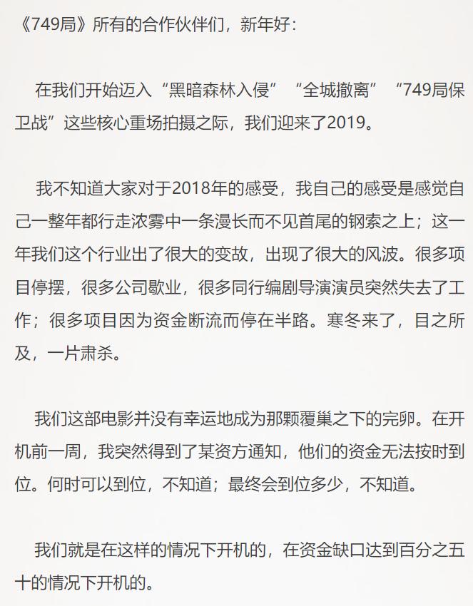2018年的最后一天,陆川发布了一封信《致749局所有合作伙伴》。一开始,他提到了749局的难度:开机前一周,他突然得到一个管理层的通知,资金无法到位。“不清楚什么时候能到位;不清楚能到位多少。”
