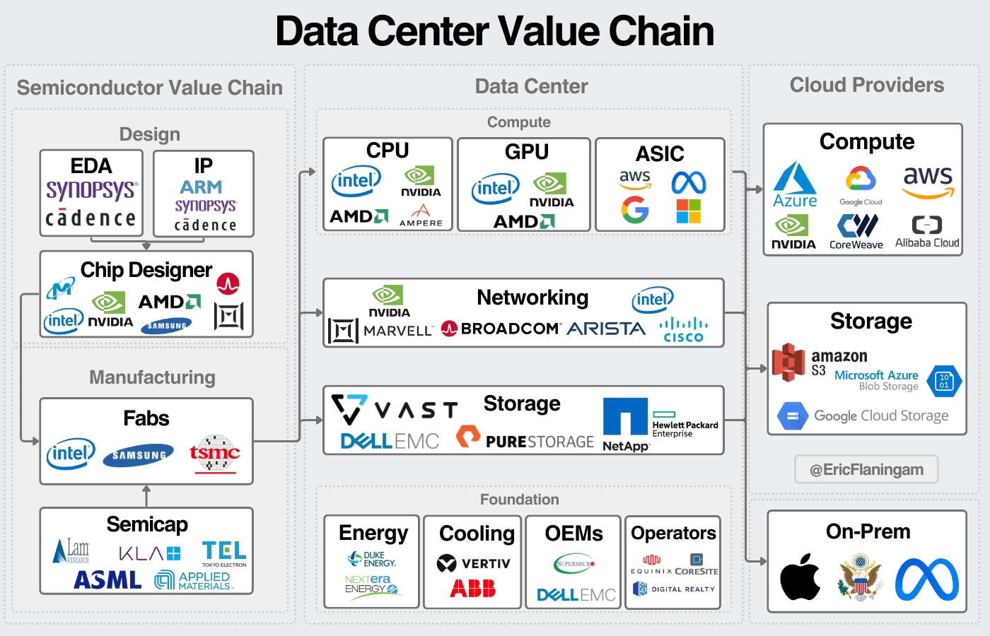 从广义上讲,所涉及的市场可以分为半导体(及其价值链)、数据中心(和能源)、云层平台,模型,数据和网络层。