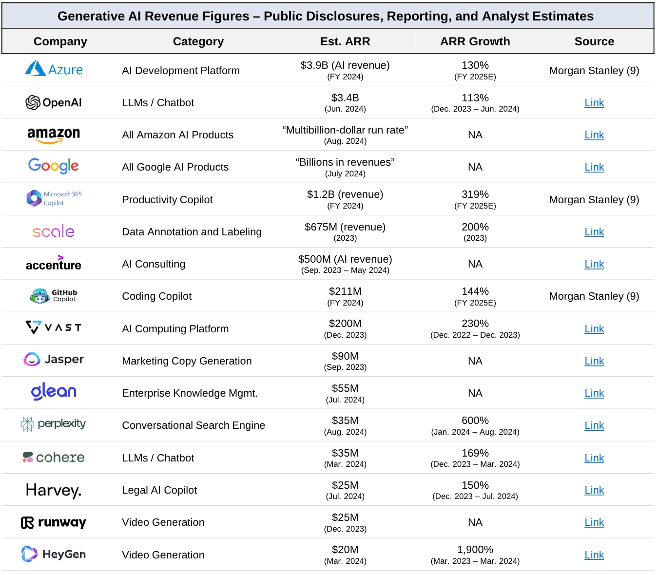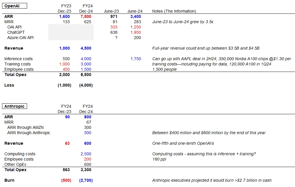 我们对 AI 应用收益的最佳指标来源于模型收益(OpenAI 的 API 收益估计为 15 亿美金,Anthropic 2024 年收入估计为 6 亿美金)。Altimeter 的 Freda Duan 详细分析了 OpenAI 与 Anthropic 对财务状况的估计。