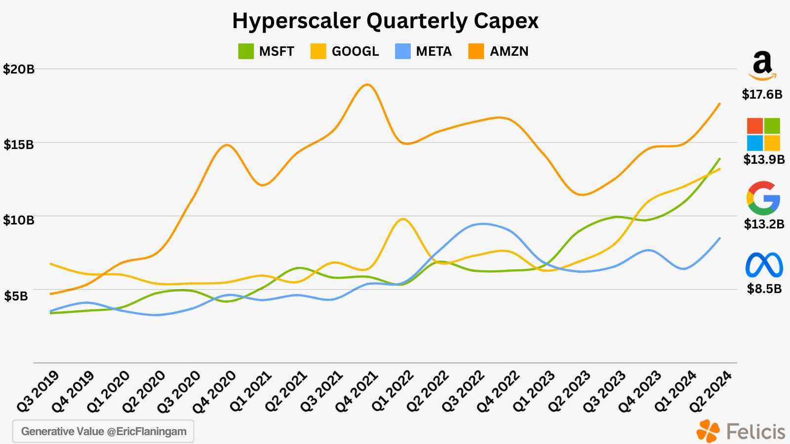 在过去的四个季度,亚马逊、谷歌、微软和微软 Meta 总资本支出已达到 1770 亿美金。从 2023 年度第二季度到了 2024 2008年第二季度,该数字平均增长 59%。数字令人瞠目结舌,但有两点可能是真的: