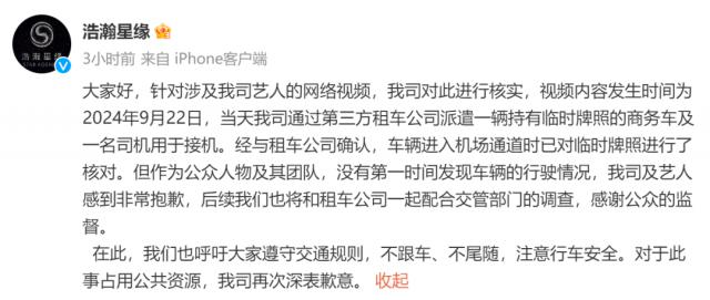 10 月 2 当天晚上,田曦薇经纪公司发布了一份关于无牌车违反交通规则的信息,称视频内容的发生时间是 9 月 22 日本,经核实,该车为第三方租车公司派出的车辆拥有临时牌照。我们公司和艺术家对“我们对没有第一时间发现车辆的行驶状况感到非常抱歉”,并表示将与租车公司合作,配合交通部门后续调查。