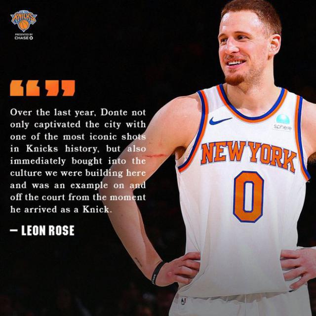 谈到迪文琴佐,莱昂 - 罗斯写道:“在过去的一年里,唐特(迪文琴佐)不仅以尼克斯历史上最具标志性的进球之一征服了这座城市,还立即融入了我们这边建立的文化。从他作为尼克斯球员来到这里的那一刻起,他就成了场上场下的榜样。”