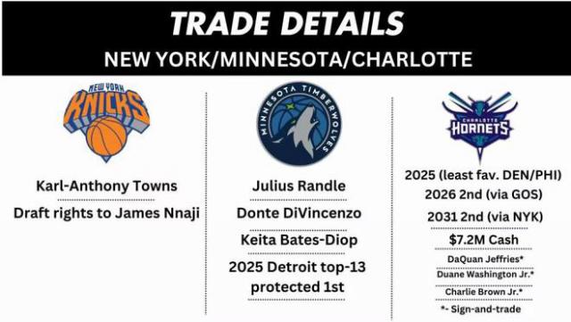 森林狼得到:兰德尔(来自尼克斯)、迪文琴佐(来自尼克斯)、贝茨 - 迪奥普(来自尼克斯)、2025 年活塞的前 13 第一轮保护顺位签(来自尼克斯);