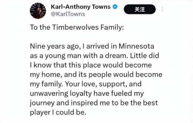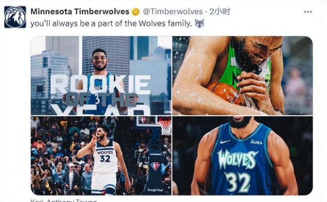 森林狼也感谢唐斯,并且说唐斯永远是这个大家庭的一员。