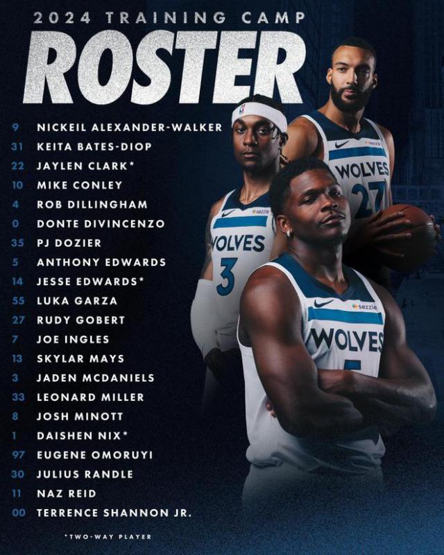 16 常规阵容:戈贝尔、爱德华兹、兰德尔、麦克丹尼尔斯、里德、迪文琴佐、康利、迪林厄姆、亚历山大学。 - 沃克、贝茨 - 迪奥普,小香浓,加尔萨,英格尔斯,米诺特,米勒,多齐尔(不保证)