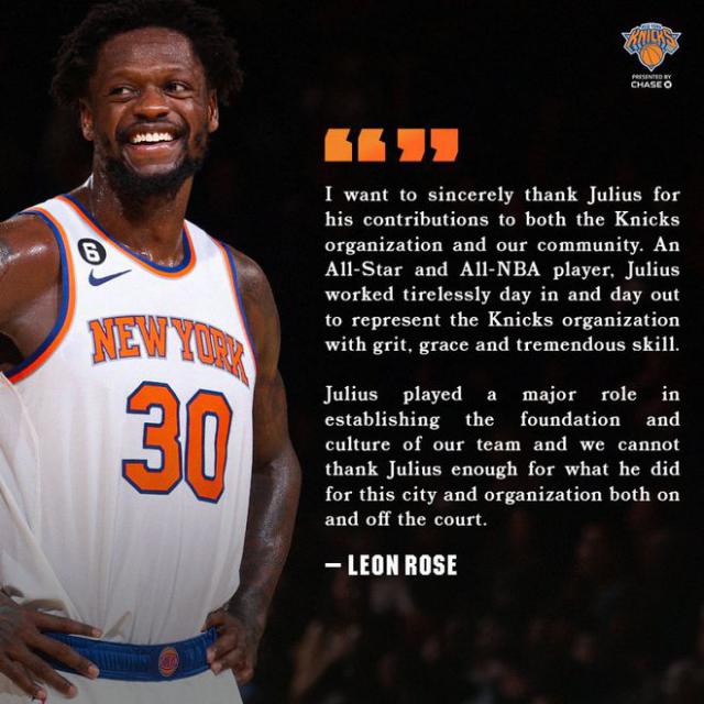 谈到兰德尔,莱昂 - “我想真诚地感谢朱利叶斯(兰德尔)对我们尼克斯和社区的贡献,”罗斯在声明中写道。身为全明星和最佳阵容的球员,他日复一日,不知疲倦地训练,以勇气、优雅和非凡的球技代表尼克斯。他在建立我们团队的基础和文化方面发挥了重要作用,我们非常感谢他在球场内外为这个城市和这个团队所做的一切。"