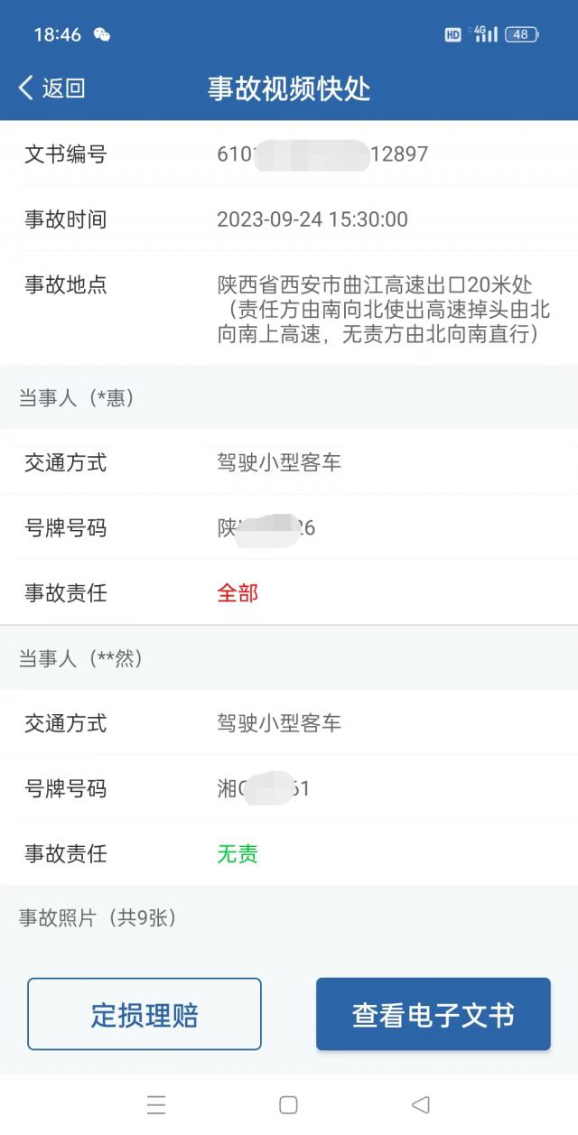 5、单击“事故细节”查看定责结果,右下方单击“查看电子文件”,即可查看。