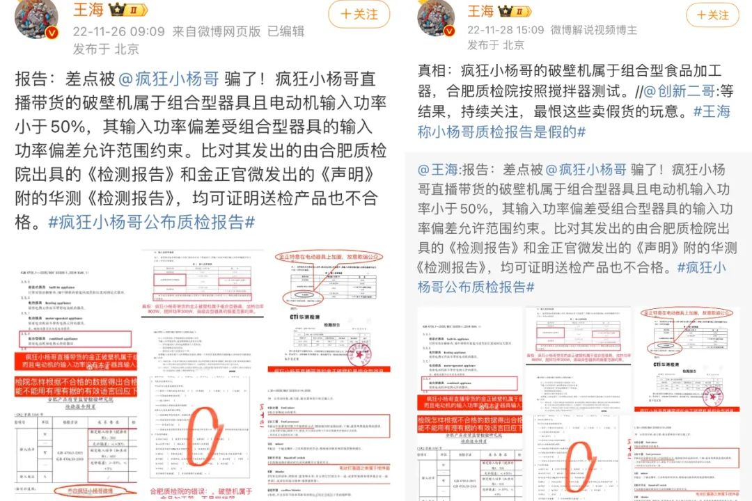 “王海”也是互联网上的老造假者。其最著名的记录是2022年底向“疯狂小杨哥”开火,称其直播间销售的破壁机和碎肉机都是虚标功率。这已经不是第一次打假辛吉飞了。早在去年8月,“王海”就称“辛吉飞”带来的奶粉含有违法成分,检测结果为有毒有害商品。