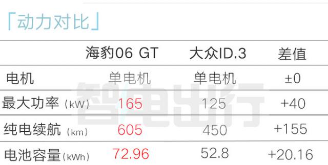 海豹 06 GT 后驱型号搭载 160kW 和 165kW 两种永磁电机,匹配 59.52kWh、72.96kWh 电池组,续航里程 505km、605km;四轮驱动型号搭载 110kW 200kW 前后双电机,匹配 72.96kWh 电池组,续航里程 动力和续航比大众多550公里。 ID.3 更强。